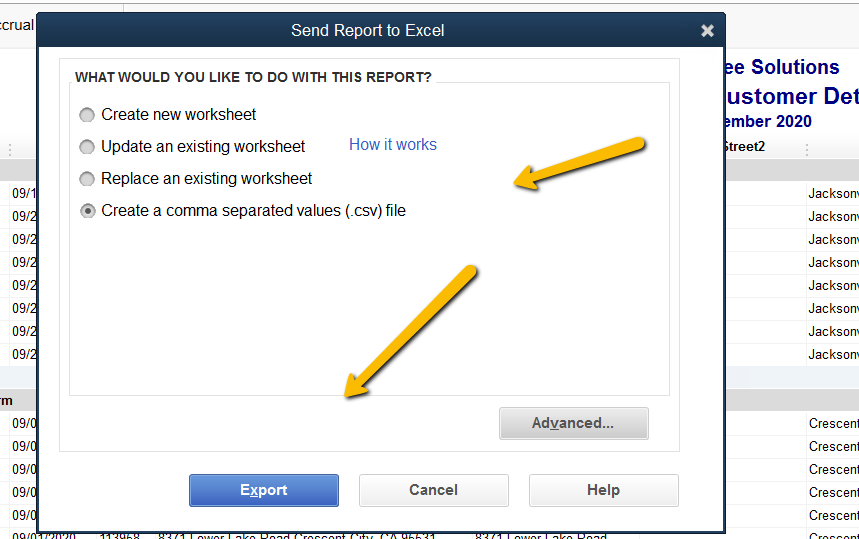 - Select 'Create a comma separated values (.csv) file' and then click Export.